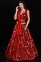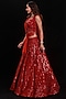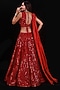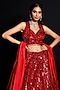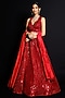 Featuring a red lehenga in organza base with sequins and beaded embroidery. It is paired with a matching blouse and a silk dupatta.