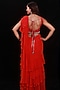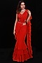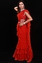 Featuring a red saree in georgette base with mirror, cutdana beads, and shells embroidery. It is paired with a matching raw silk blouse and a belt.