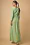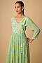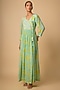Featuring a green maxi dress in crepe base with floral print and zari embroidery. Style it with pearl stud earrings, a roomy tote bag, and comfortable flats, perfect for beach outings, vacations, or holiday wear.