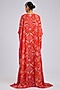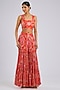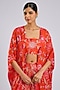 Featuring an orange cape in crepe base. It is paired with a blouse and pants. Accentuate it with statement earrings, a clutch bag and high heels for a festive occasion, sangeet or family gathering.
