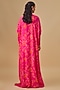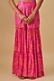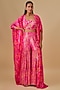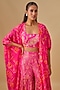 Featuring a pink cape in crepe silk base with floral print. It is paired with an embroidered bustier and gathered pants. Accentuate it with statement jewellery and heels for a sangeet or wedding ceremony.