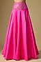 Featuring a pink skirt in silk base, adorned with a gleaming zari belt. It is paired with a silk strappy corset. Accentuate it with statement jewellery, heels, and a clutch for an engagement or a wedding ceremony.