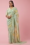 Featuring a powder blue saree in georgette base. It is paired with a floral blouse. Accentuate with dangler earrings and heels for a sangeet or engagement ceremony.