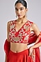 Featuring a red lehenga in silk base with print and hand embroidery. It is paired with an embroidered blouse and a dupatta. Accentuate it with statement jewellery and heels for festive occasions, sangeet or wedding ceremonies.