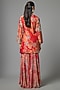 Featuring a red kurta in silk base. It is paired with sharara pants and a dupatta. Accentuate it with statement earrings and block heels for a festive occasion or family gathering.