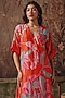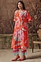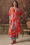 Featuring a scarlet kurta in silk base with v-neck, floral print and sequins embellishment. It is paired with striped trousers. Accentuate it with statement earrings and heels for festive ceremonies.