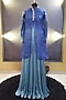 Featuring an ombre blue green gown with embroidery. It is paired with a matching jacket.