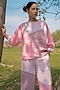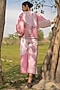Featuring a coral pink top in linen base with print and machine embroidery. This contains only one piece.