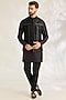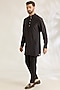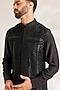 Featuring a black bundi jacket in silk base. It is paired with a kurta and pants. Style it with mojaris for a festive occasion, wedding, or engagement ceremony, and complete the look with a statement brooch or pocket square along with a sleek watch for a polished finish.