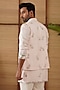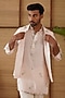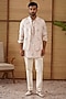 Featuring a powder pink nehru jacket in organza, moga silk and modal base with multi-colored thread buttons, dori and patch work. It is paired with a kurta and cotton satin lycra pants. Perfect wear for a festive occasion or sangeet ceremony, exuding traditional charm and elegance.
