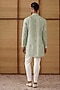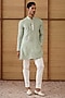 Featuring a sage green kurta in organza and moga silk base with multi-colored thread buttons, dori and patch work. It is paired with cotton satin lycra pants. Perfect wear for a festive occasion or mehendi ceremony, exuding traditional charm and elegance.