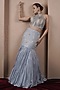 Featuring a blue blouse in hand woven kasab silk base with wired halter neck. It is paired with a fish cut lehenga. Accentuate it with polki jewellery and block heels for cocktail, sangeet or wedding ceremony.
