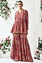 Featuring a pink gathered peplum in cotton silk base with print. It is paired with sharara pants. Accentuate it with statement earrings and heels for festive gatherings or intimate celebrations.