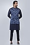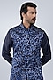 Featuring a navy blue shaded bundi jacket in silk base with resham thread embroidery. It is paired with a kurta and pants. Perfect wear for festive occasions or pre-wedding ceremonies.