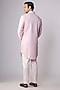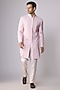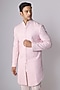 Featuring a baby pink sherwani in silk base with embroidery. It is paired with pants. Accentuate it with a pair of mojris, safa and a stole for a perfect wedding look