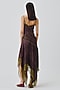 Featuring a plum-black dress in modal satin base with handblock ajrakh print and handkerchief hem detail. Style it with dangler earrings and sleek heels for a galas, high-end dinner party or evening party.