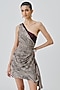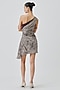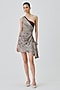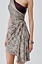 Featuring a warm beige dress in modal satin base with handblock print and one-shoulder neckline. Style it with dangler earrings and sleek heels for a high-end dinner party, birthday, cocktail or evening party.