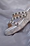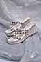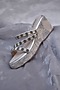 Featuring a pair of silver wedges in poly silk base with embroidery and beaded straps. It has a suede underlining and 3-inch heels. Perfect for weddings, parties, and festive glam looks.