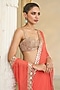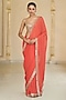 Featuring a coral saree in georgette base. It is paired with a blouse. Accentuate it with dangler earrings and heels for a festive occasion, wedding or engagement ceremony.
