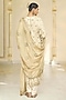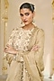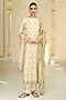 Arpita Mehta presents a cream bandhani kurta in georgette base. It is paired with dupion silk pants and a tissue dupatta. Perfect for festive occasion, sangeet or reception nights, these golden outfits exude modern glamour, style them with statement earrings and soft, dewy makeup for an elegant finish.