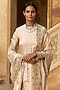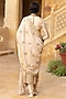 Arpita Mehta features a mesmerizing Gold Kurta Set that captivates with its elegance. The eye-catching kurta is crafted in tissue with hand embroidery. It is paired with dupion silk churidar pants and a dupatta. Accessorize the designer kurta set with statement earrings and heels for festive occasions, showcasing style and sophistication.