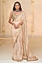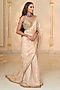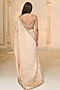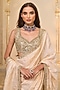 Arpita Mehta presents a golden saree in tissue base with hand embroidery. It is paired with a net embroidered blouse. Style these intricately embroidered saree with statement polki or kundan jewelry and a sleek bun adorned with fresh flowers. Opt for subtle glam makeup with a focus on the eyes and nude lips to balance the rich hues of the ensemble.