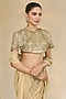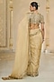 Arpita Mehta presents a golden saree in tissue base with hand embroidery. It is paired with a net embroidered blouse. Style these intricately embroidered saree with statement polki or kundan jewelry and a sleek bun adorned with fresh flowers. Opt for subtle glam makeup with a focus on the eyes and nude lips to balance the rich hues of the ensemble.