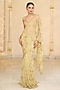 Arpita Mehta presents a green ruffled saree in net base with jaal hand embroidery. It is paired with an embroidered blouse. Style these intricately embroidered saree with statement polki or kundan jewelry and a sleek bun adorned with fresh flowers. Opt for subtle glam makeup with a focus on the eyes and nude lips to balance the rich hues of the ensemble.