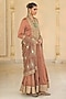 Arpita Mehta presents a light brick anarkali in tissue base with hand embroidery. It is paired with dupion silk churidar pants and a net jaal dupatta. Perfect for festive occasion, sangeet or reception nights, these outfits exude modern glamour, style them with statement earrings and soft, dewy makeup for an elegant finish.