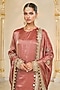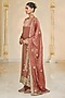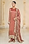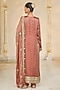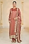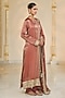 Arpita Mehta presents a light brick kurta in tissue base with hand embroidery. It is paired with dupion silk churidar pants and a dupatta. Perfect for festive occasion, sangeet or reception nights, these outfits exude modern glamour, style them with statement earrings and soft, dewy makeup for an elegant finish.