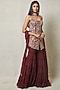 Featuring a maroon kurta in organza and silk base with embroidery. It is paired with matching sharara pants and a chiffon dupatta.