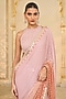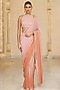 Arpita Mehta presents a mauve shaded saree in georgette base with hand embroidery. It is paired with an embroidered blouse. Style these intricately embroidered saree with statement polki or kundan jewelry and a sleek bun adorned with fresh flowers. Opt for subtle glam makeup with a focus on the eyes and nude lips to balance the rich hues of the ensemble.