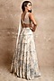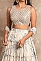 Featuring an off-white tiered skirt in georgette base with leaf print. It is paired with a contrasting blouse and a matching dupatta.