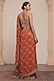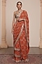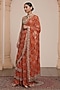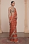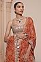 Featuring an orange and gold tiered ruffled saree in georgette base with thread embroidery. It is paired with a blouse. Style this saree with diamond jewellery, block heels and a sleek bun, an ideal choice for your wedding day, sangeet or engagement ceremony.