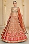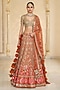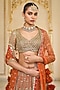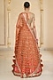 Arpita Mehta presents an orange lehenga in organza base with thread and mirror hand embroidery. It is paired with a net embroidered blouse and a net dupatta. Style these intricately embroidered lehengas with statement polki or kundan jewelry and a sleek bun adorned with fresh flowers. Opt for subtle glam makeup with a focus on the eyes and nude lips to balance the rich hues of the ensemble.