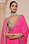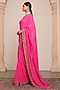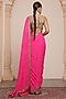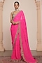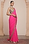Featuring a pink saree in georgette base with golden embroidery. It is paired with a blouse and a cotton satin underskirt. Style this saree with diamond jewellery, block heels and a sleek bun, an ideal choice for your wedding day, sangeet or engagement ceremony.