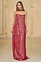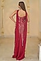 Arpita Mehta presents a red off-shoulder bodycon dress in georgette base. It is paired with a dupatta. Perfect for cocktail or reception nights, these golden outfits exude modern glamour, style them with statement earrings and soft, dewy makeup for an elegant finish.