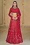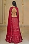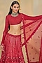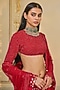 Arpita Mehta presents a red lehenga in net base with linear hand embroidery. It is paired with a georgette embroidered blouse and a net dupatta. Style these intricately embroidered lehengas with statement polki or kundan jewelry and a sleek bun adorned with fresh flowers. Opt for subtle glam makeup with a focus on the eyes and nude lips to balance the rich hues of the ensemble.