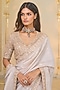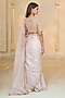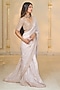 Arpita Mehta presents a rose gold saree in tissue base with hand embroidery. It is paired with a net embroidered blouse. Style these intricately embroidered saree with statement polki or kundan jewelry and a sleek bun adorned with fresh flowers. Opt for subtle glam makeup with a focus on the eyes and nude lips to balance the rich hues of the ensemble.
