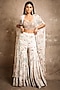 Featuring a sand beige cape in georgette base with floral print. It is paired with a matching blouse and crepe silk gharara pants.