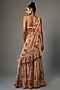Featuring a sand and toasted orange bandeau blouse in georgette base with garden print. It is paired with matching gharara pants and a drape.