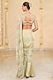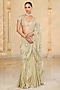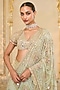 Arpita Mehta presents a sea green saree in tissue base with godet hand embroidery. It is paired with an embroidered blouse. Style these intricately embroidered saree with statement polki or kundan jewelry and a sleek bun adorned with fresh flowers. Opt for subtle glam makeup with a focus on the eyes and nude lips to balance the rich hues of the ensemble.