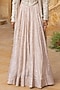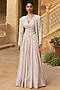 Arpita Mehta features a mesmerizing Silver Skirt Set that captivates with its elegance. The eye-catching skirt is crafted in tissue. It is paired with a georgette jacket having mirror and cutdana hand embroidery, including a blouse. Accessorize the designer skirt set with statement earrings and heels for festive occasions, showcasing style and sophistication.