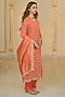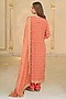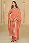 Arpita Mehta presents a warm coral bandhani kurta in georgette base. It is paired with dupion silk churidar pants and a tissue dupatta. Perfect for festive occasion, mehendi or reception nights, these outfits exude modern glamour, style them with statement earrings and soft, dewy makeup for an elegant finish.