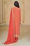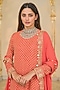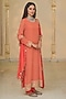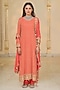 Arpita Mehta presents a warm coral kurta in georgette base. It is paired with dupion silk churidar pants and a dupatta. Perfect for festive occasion, sangeet or reception nights, these outfits exude modern glamour, style them with statement earrings and soft, dewy makeup for an elegant finish.