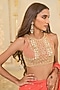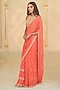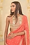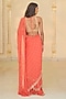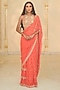 Arpita Mehta presents a warm coral ruffled saree in georgette base. It is paired with a net blouse. Style these intricately embroidered saree with statement polki or kundan jewelry and a sleek bun adorned with fresh flowers. Opt for subtle glam makeup with a focus on the eyes and nude lips to balance the rich hues of the ensemble.