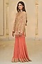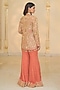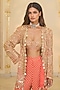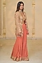 Arpita Mehta presents a warm coral jacket in georgette base. It is paired with a blouse and sharara pants. Perfect for festive occasion, sangeet or reception nights, these outfits exude modern glamour, style them with statement earrings and soft, dewy makeup for an elegant finish.