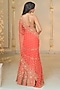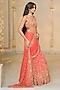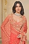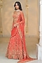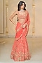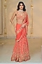 Arpita Mehta presents a warm coral draped saree in net base. It is paired with a blouse. Style these intricately embroidered saree with statement polki or kundan jewelry and a sleek bun adorned with fresh flowers. Opt for subtle glam makeup with a focus on the eyes and nude lips to balance the rich hues of the ensemble.