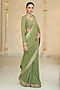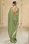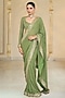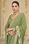Arpita Mehta presents a warm olive saree in georgette base with hand embroidery. It is paired with a blouse. Style these intricately embroidered saree with statement polki or kundan jewelry and a sleek bun adorned with fresh flowers. Opt for subtle glam makeup with a focus on the eyes and nude lips to balance the rich hues of the ensemble.