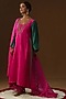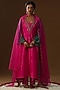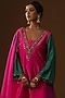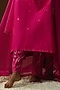 Featuring a hot pink kurta in pure raw silk base with print and dori embroidery. It is paired with chanderi pants and an organza hand painted dupatta. Accentuate the designer set with swarovski jewellery, embellished heels and a potli bag for a look, Perfect wear for a festive occasion, sangeet or haldi ceremony.
